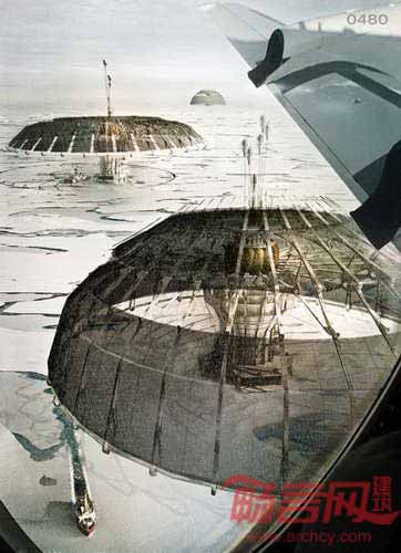 建筑杂志eVolo主办的年度竞赛旨在发掘创新性的未来摩天楼方案。今年竞赛的冠军授予了一个改造极地冰盖的巨型漂浮伞形概念设计方案。“极地伞”方案来自美国建筑师Derek Pirozzi,巨型伞状结构使海水凝固,为受全球变暖影响最大的北极地区补充了冰棚。