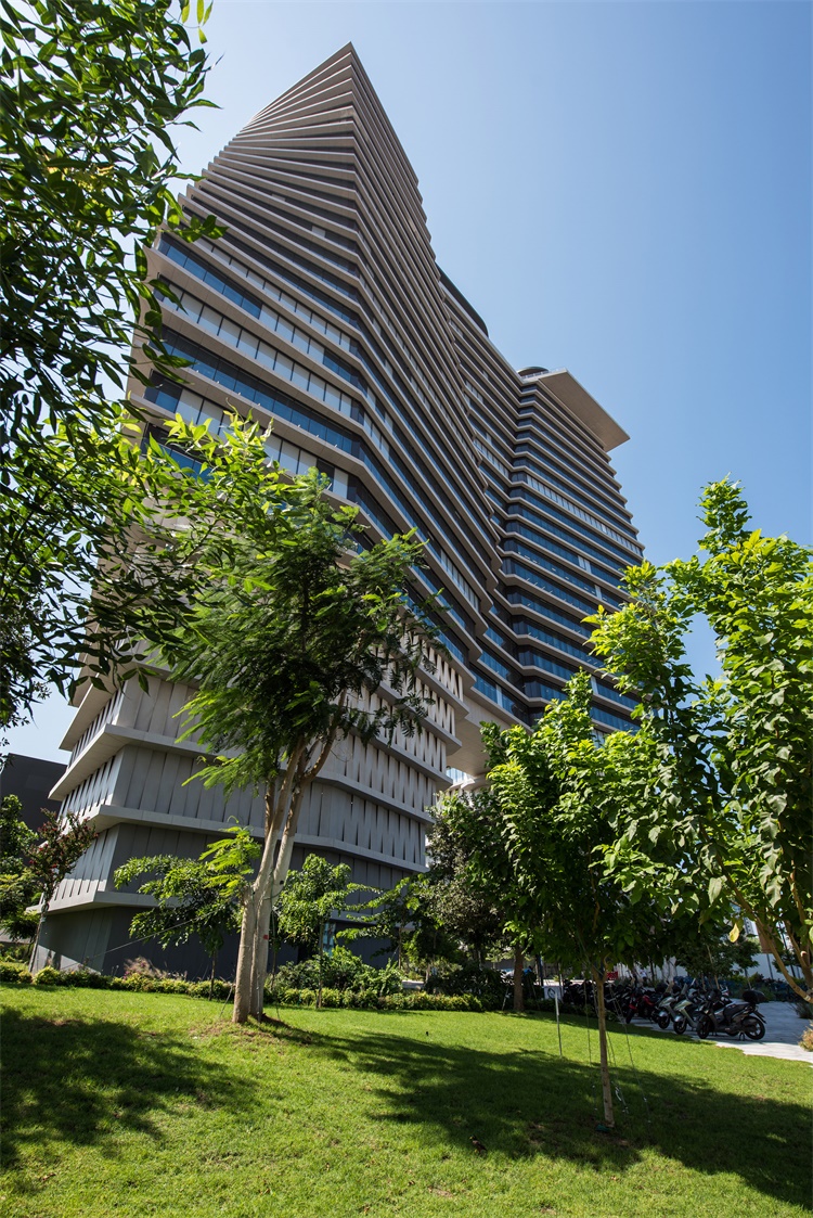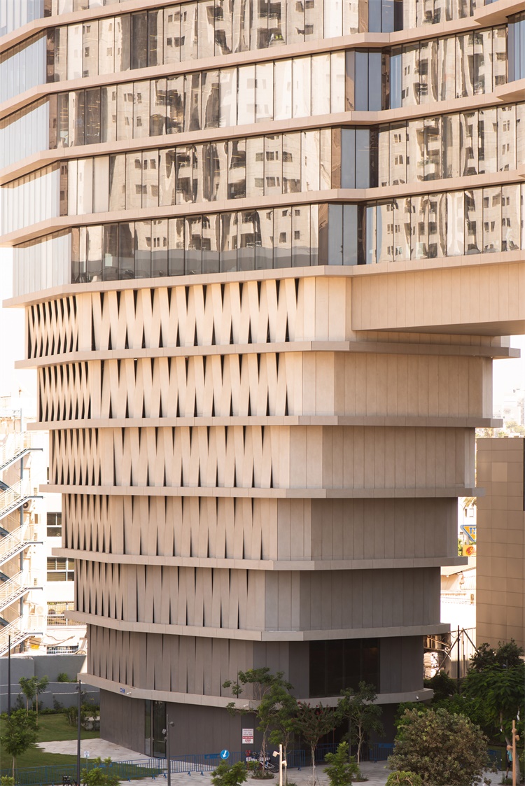 我们希望能减少占地面积,在缺少场地的调价下,为城市增添一座公园,建筑师透露。阿拉德同以色列当地的Yashar事务所合作,完成了这一项目。建筑技术设备设在一层,将屋面预留给露台空间。建筑外墙采用西班牙Cosentino公司生产的Dekton人造石。针织型的人造石为大楼提供通风和结构功能。项目室内、天花板、内墙、饰面也运用了该材料。