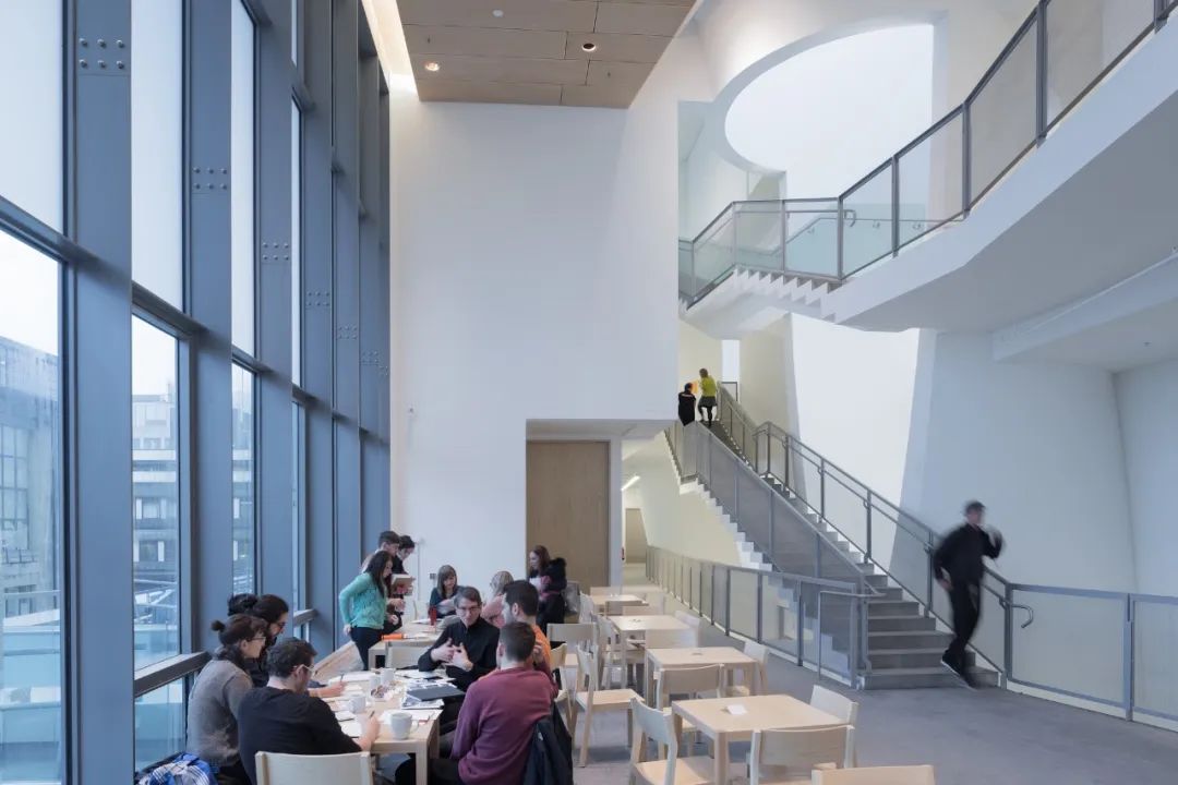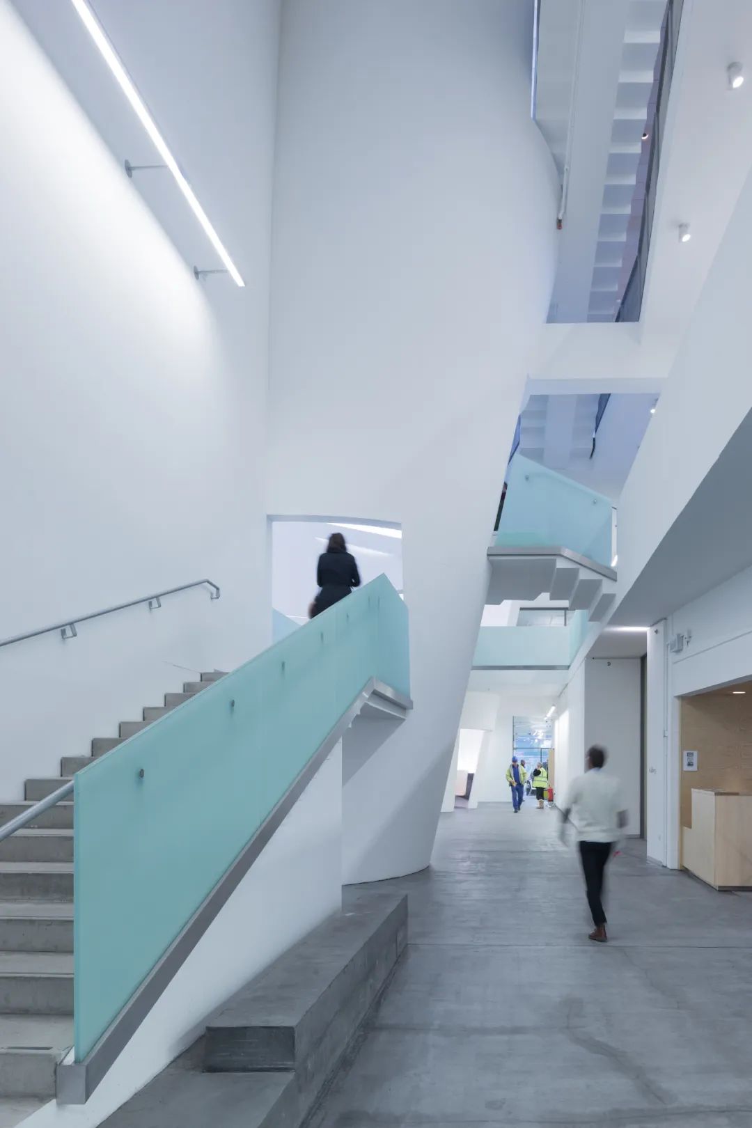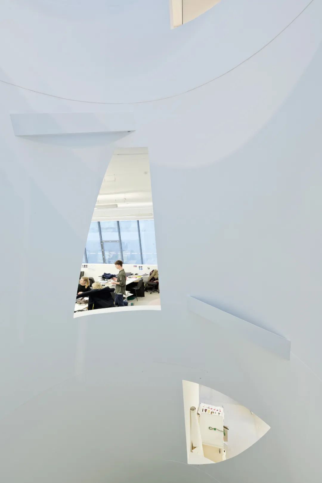 由 Steven Holl Architects 设计的里德大楼(The Reid Building)作为格拉斯哥艺术学院的新成员,与 1909 年由查尔斯·雷尼·麦金托什(Charles Rennie Mackintosh)设计的主大楼形成鲜明对比。两栋建筑间有着“共生关系”,并且它们补全了彼此的整体感受。里德大楼以半透明材质为主体,并以此与麦金托什大楼中的砖石结构成了强烈对比。由此,大量的光线透过玻璃进入室内,微妙地展示了城市中央的校园生活体量,同时也体现了艺术的前瞻性。