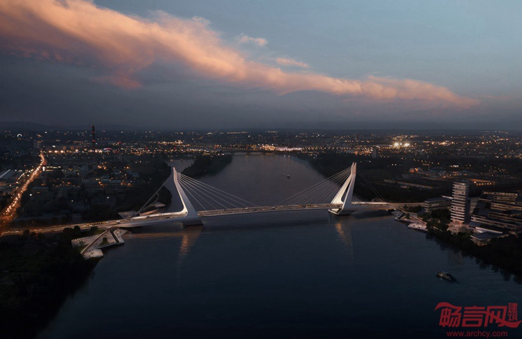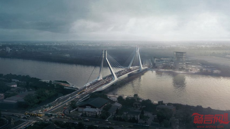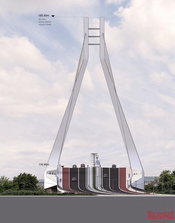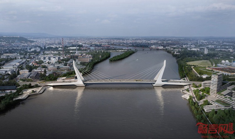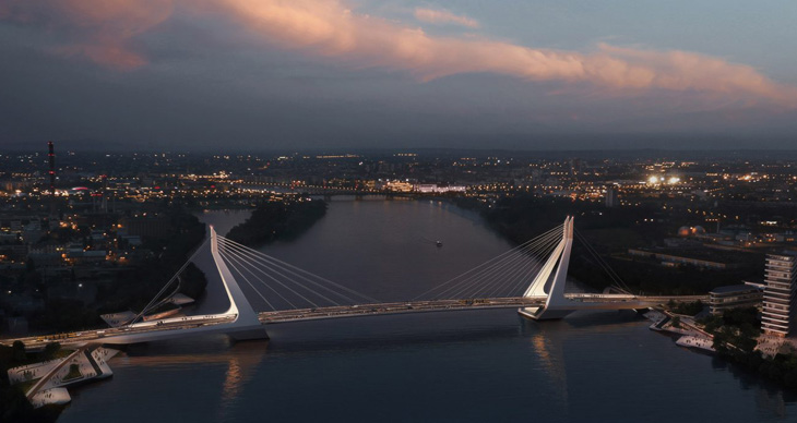 荷兰UNStudio工作室赢得了布达佩斯多瑙河畔桥梁的设计竞赛优胜。该项目将成为连接所在城市及城市南侧Ujbuda、Csepel等地的门户。获胜方案是一座斜拉索结构,跨度220米,位于93米的三角形支撑结构上方。两侧结构使桥总长达到500米。桥梁设有四条车道,另外有两条电车道,两条分别供自行车及行人使用的道路。