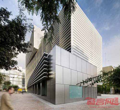 根据西班牙建筑要求,政府办公楼必须尽可能利用自然光,建筑立面设有大玻璃窗,为防护太阳直接辐射,添加了铝制遮阳板条。