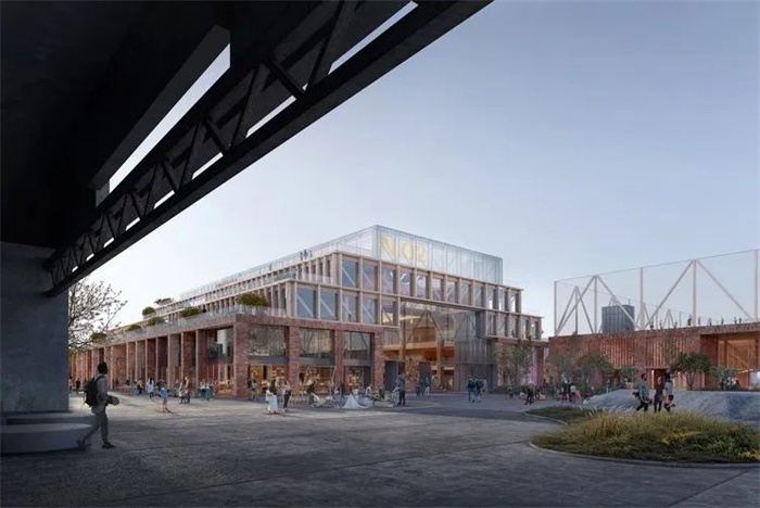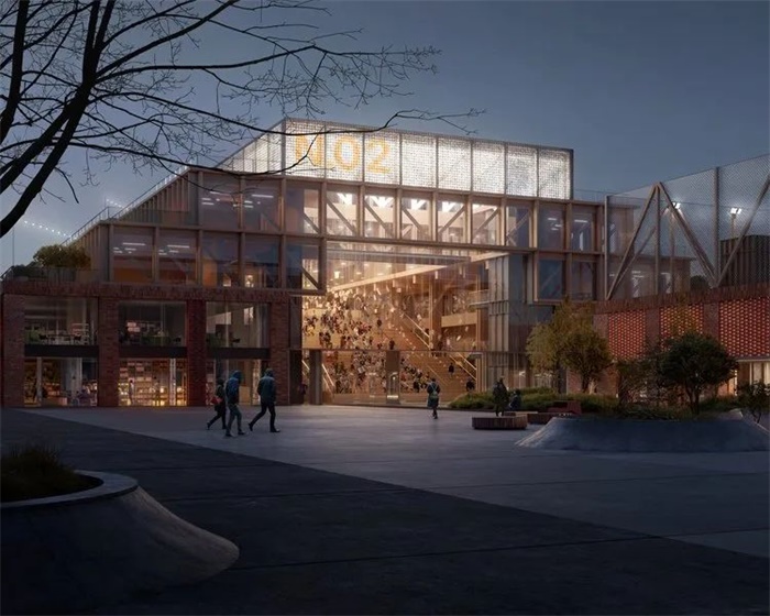 项目中心将有一个庞大的圆形剧场,通过一个大的“机库门”开口面向一个新的公民广场。中央中庭将有一条内部“街道”贯穿其中,并让位于一系列宽敞的开放式体量,容纳中心面向公众的动态设施计划,创造一个完全活跃和温馨的地面层。这些底层空间由当地回收的红砖建造的独特围护结构构成,将通向精心策划的周围景观,从城市广场到遮蔽的公园区以及广阔的绿地。