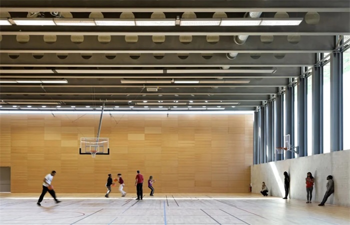 一栋五层楼的新建筑容纳了专门用于体育活动的新空间,包括室内攀岩墙、健身房、舞蹈室、健身室、看台、更衣设施、服务设备和办公室。通透的建筑标示出整个场地新的主入口,面对着有轨电车站,通过一条内部通道与1972年建成的体育馆相连。