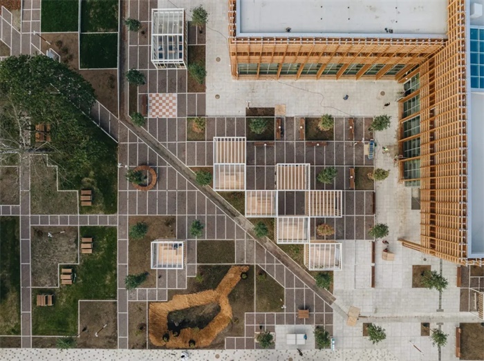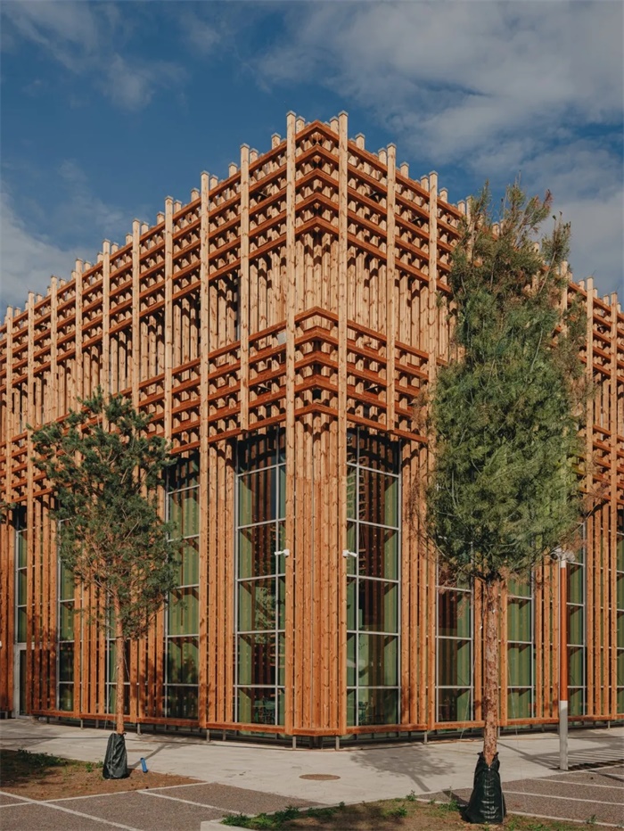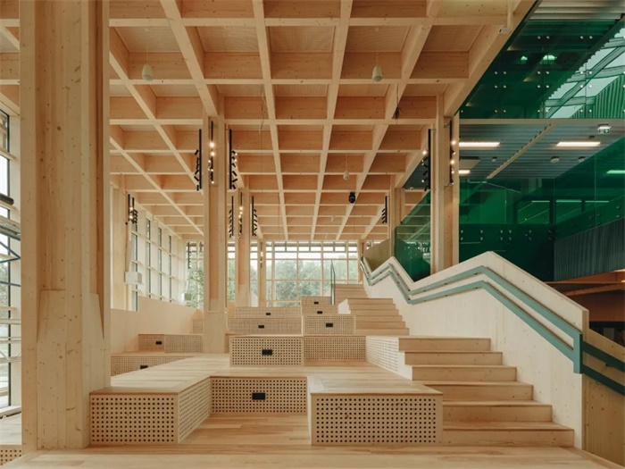 除了承重结构外,木材在建筑中还扮演了多种角色,例如作为光滑温暖的长凳、穿孔吸音板以及流线型的扶手,而木格栅立面则起到遮阳作用。此外,设计团队还沿着建筑创造了长凳和小角落的景观。在功能多样的户外区域中,沿着主路设置的户外展览区的景观则由学生自己每年重新设计。