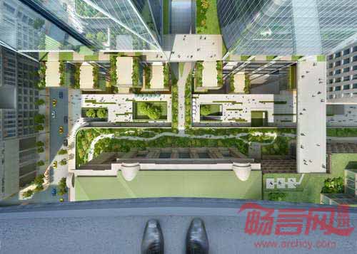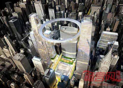 根据SOM的方案,在两栋新办公大楼之间将设立一个面包圈形状的建筑结构,该项目将配合纽约市政规划部门提出的区域重整提议。