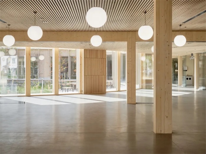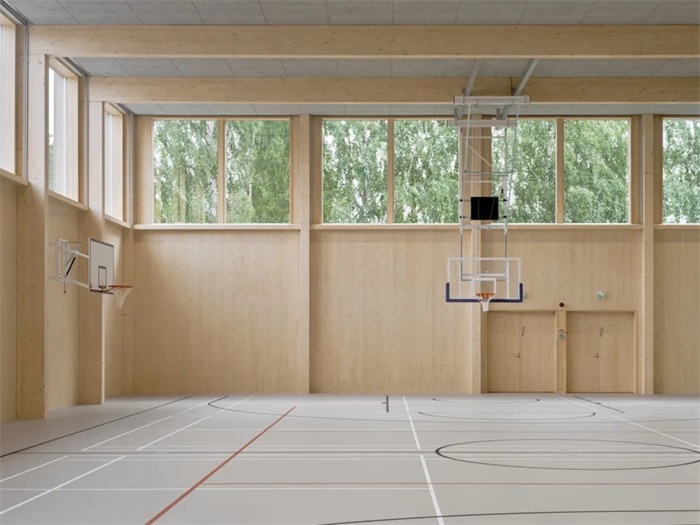 五个建筑体量各有特色,且功能多样,包括学习空间、食堂、体育馆、科学和艺术设施以及幼儿园。多功能建筑还能在晚上和周末为当地居民提供聚集的空间。学习空间适应性非常强,其中配备了可移动的隔断,能够满足不同使用者的需求。整栋建筑都是由木材和其它天然材料制成,进一步增强了与自然之间的联系,营造了温馨、平和的氛围,为学生们打造了舒适的学习环境。