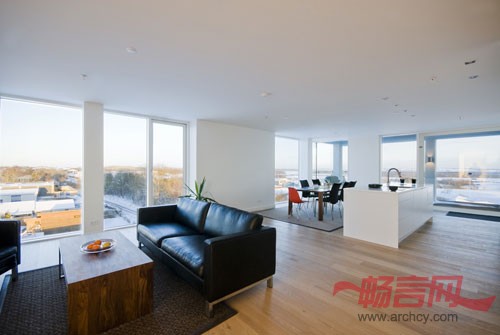 这个不同寻常的错位结构形成了广阔的户外空间,在这里可以欣赏到奥尔胡斯海湾和城市的美景。无论位于仓库结构的南面或者北面,每一间公寓都充满了自然光线。