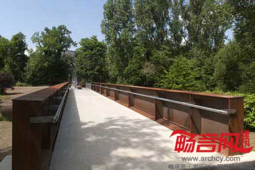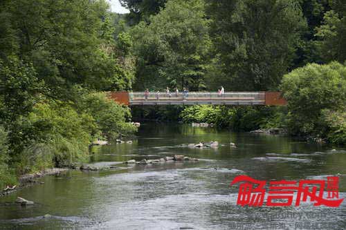 和由于年久即将拆除的旧桥一样,新桥也在绿树掩映之中。桥身为红色耐候钢,与绿色交相辉映,筑成一道秀丽风景。