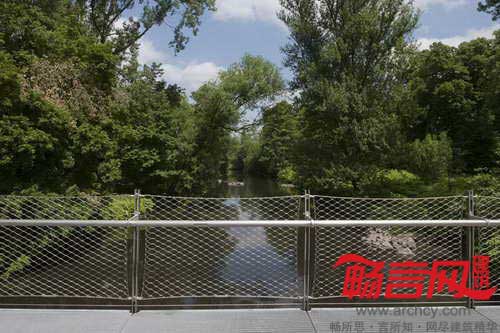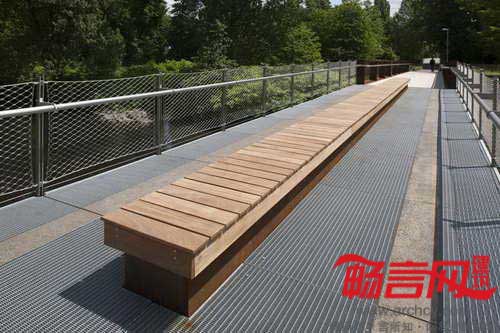 桥梁中间有座椅,表面使用热带硬木。桥梁中部的桥面采用架在横梁上的自承式格栅结构。