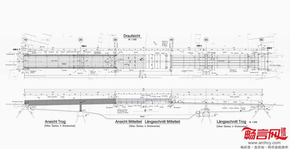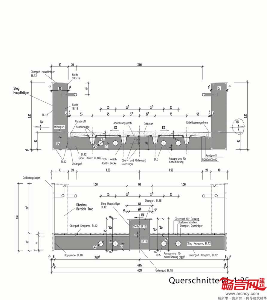 桥梁中部宽17米,中部和两端的横梁构成了一个封闭盒子形状。悬梁和前部顶板形成了截面为双T的图形。