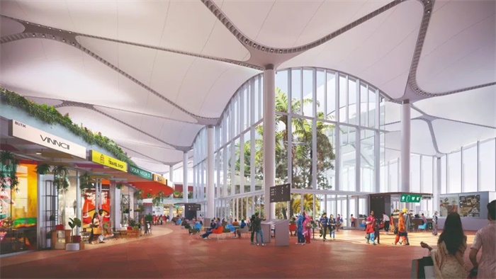 设计航站楼布局时,团队提供了一种实用简洁的方案,确保了便捷的运营操作、高效的旅客流程和直观的空间导引。通过使用当地特色的材料、颜色、纹理和图案,再加上大量利用当地绿色植物,最终塑造出一个真正根植于地域的机场航站楼。
