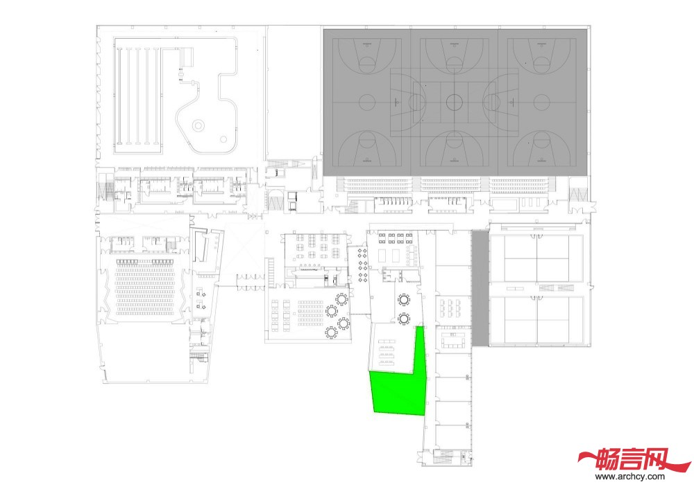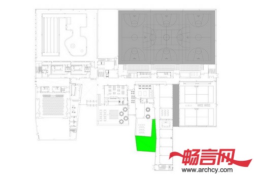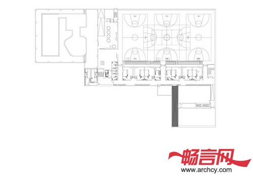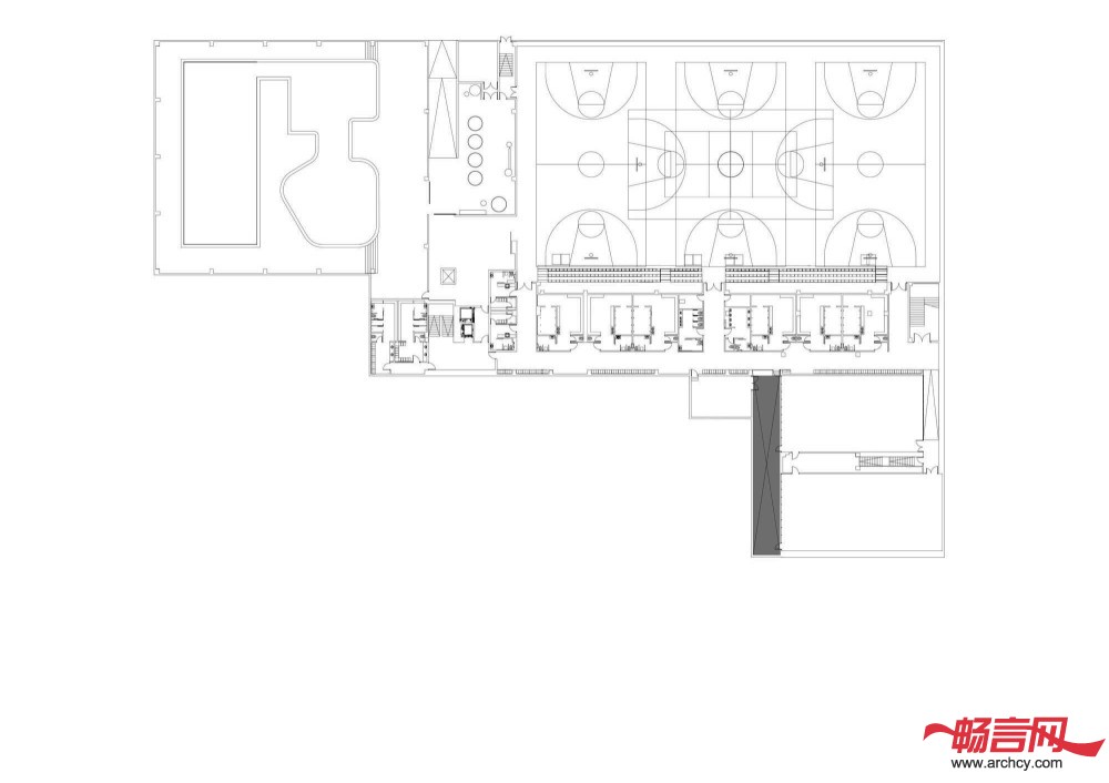 室内设计是严格根据竞标时期当地委员会技术小组制定的功能标准进行布局的。运动空间(游泳池和室内运动中心)位于建筑的北面,它是根据笛卡儿几何学确定几个空间的大小和规模的。其它的区域位于南侧,这一面的几个不规则空间朝向住宅区。其它功能空间沿着走廊布置,走廊将不同的功能空间连接了起来。通过走廊的玻璃窗,过往的行人能看到里面的活动,好像一个可以的展窗一样。