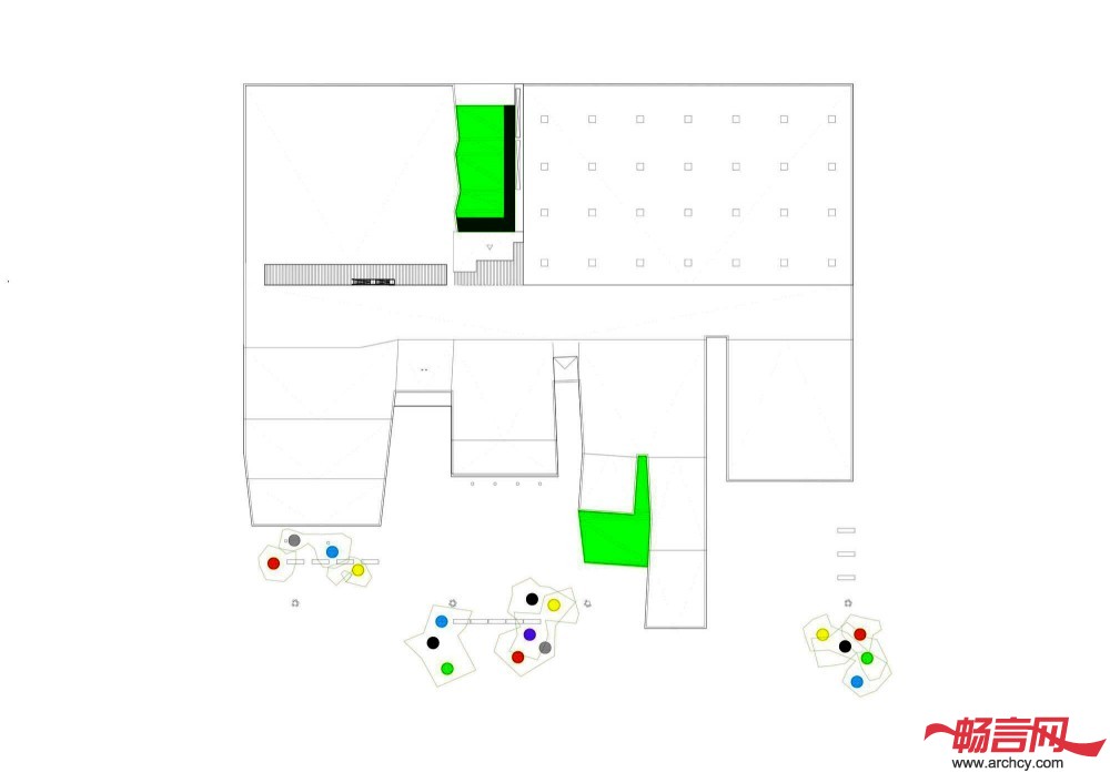 在保证室内宽敞、功能区域有序安排的前提下,建筑师将中心设计的比较开阔、开放,以吸引市民来这里,室外设计就能让人看出里面的功能:剧院、休闲和运动泳池、日光浴室、咖啡厅、内运动中心、图书馆、工作室、市民服务委员会等等。