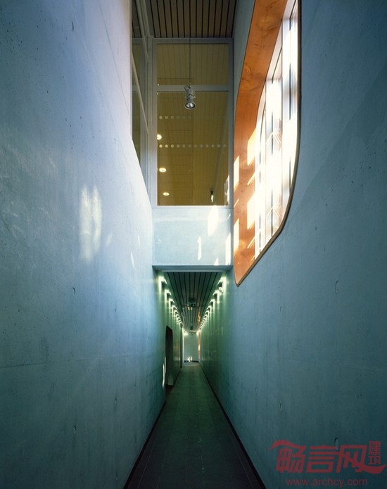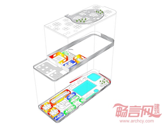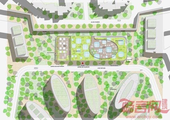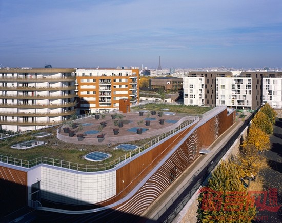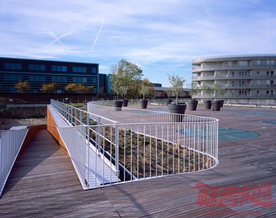 游泳池屋顶成为该设计方案中的决定性元素,屋顶带有由木板条铺设而成的椭圆形“沙滩”,顺着大楼一侧的斜坡就可以来到这里。