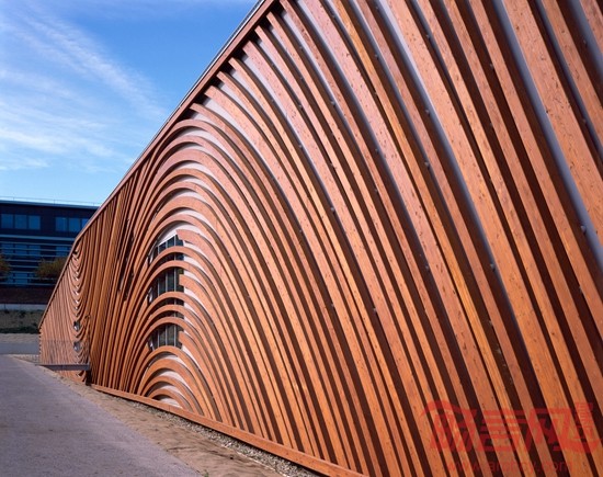 外墙上波浪形的金色木条让人想起水面的波动,也与能量和水体的流通相呼应。