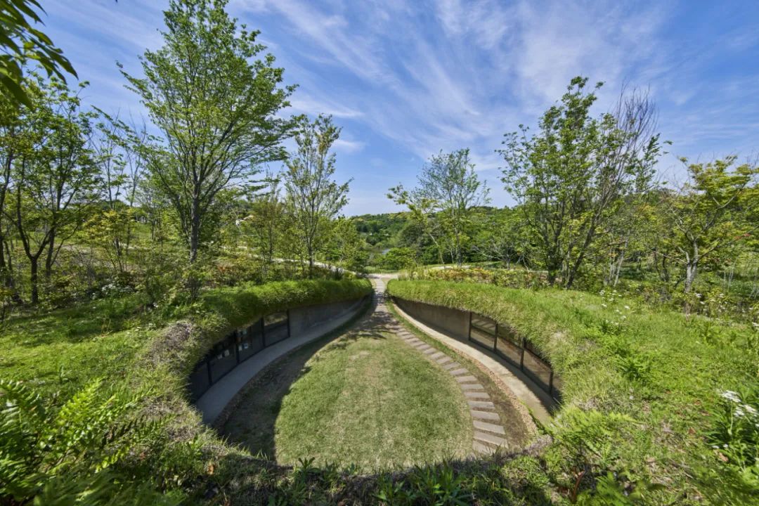 走廊上的梁和柱等建筑元素已被抹去,而混凝土空心板则从外侧挡土墙和翼墙中悬挑出来。地面、墙壁和天花板均采用土质饰面,连接平滑,种植到石板垂直边缘的草坪郁郁葱葱地垂挂下来,给空间带来一种湿润感。这一细节的设计使植物灌溉和土层保水之间的平衡可以根据季节进行调整。