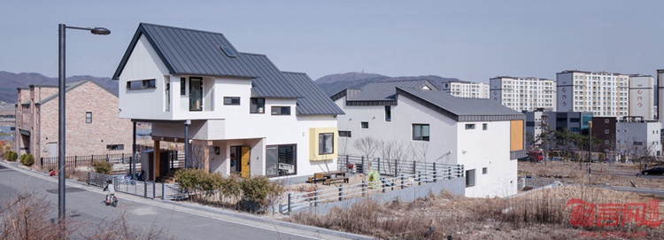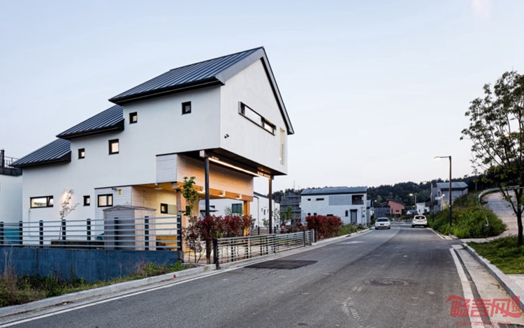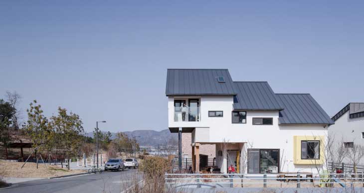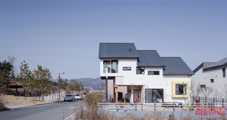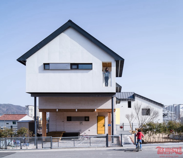 KDDH的“慢屋”位于韩国蔚山一块长方形场地上,场地西北侧是八米宽马路,面朝Hwangbang山脚。由于预计有交通拥堵和络绎不绝的登山客,设计师认为保证住户私密性很重要。因此,设计师的初步计划就是先将私人区域和公共区域分隔开。体块形状要包裹空间,并面向大山。另外,建筑下层被用于缓冲区,私人和公共区被严格分开。室内区分成三个层级,家庭区,儿童区和夫妇区。