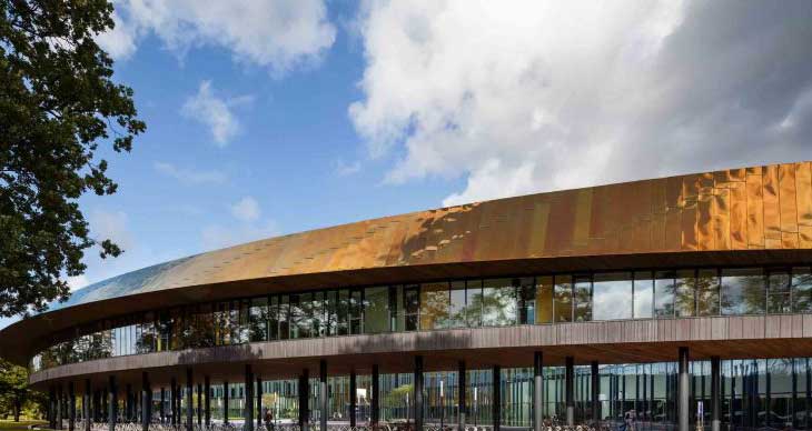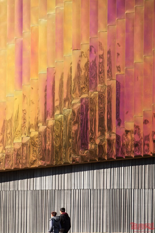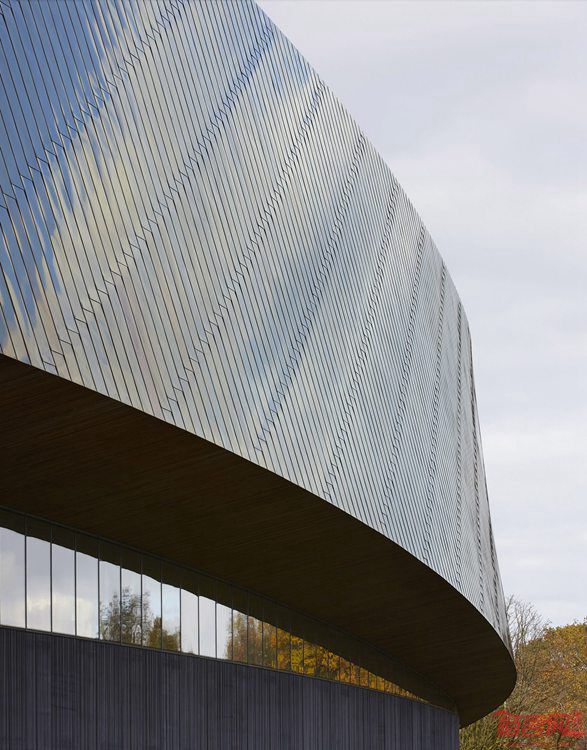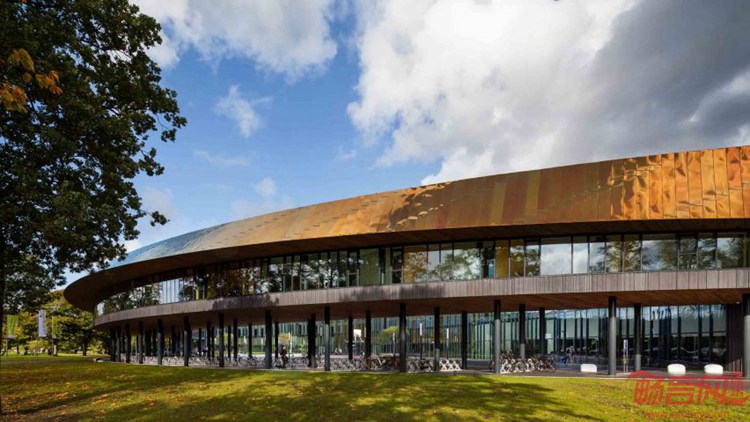 一条明亮的抛光钢制“缎带”围绕着海牙体育中心的弧形屋面。该项目由Faulkner Browns事务所设计,耗资5000万欧元的Zuiderpark体育中心提供3.3万平方米体育空间,包含健身馆,拥有真沙的海滩运动馆以及一系列体育科学及教育设施。纹理预制混凝土板构成了卵型建筑底座,与连贯闪亮的屋面构成了对比。