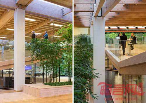设计师将宽广的室内空间划分成若干区域,并安排了供鸟类栖息的植物和树木。自然光线从巨大的天窗倾泻而下,室内能听到潺潺水声。法国艺术家Jean Dewasne将涂料罐进行了装饰设计,成为工厂中的艺术品。工作楼层中,工作人员能够使用乒乓球桌和羽毛球场地。