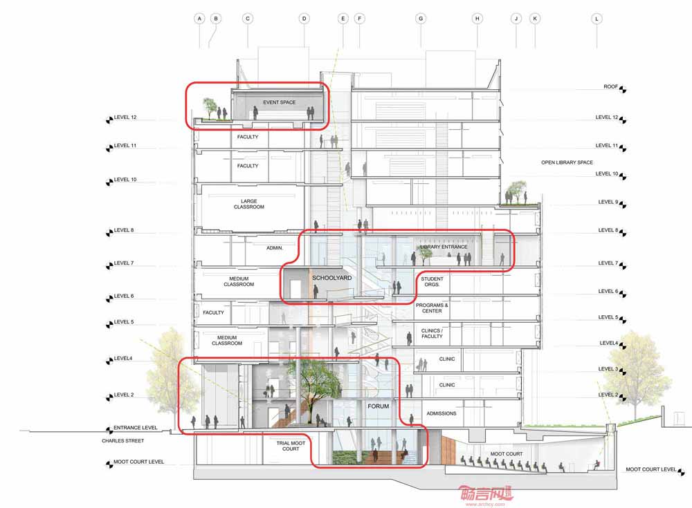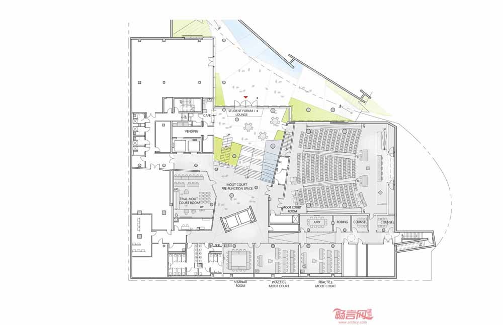 美国巴尔的摩大学为其法学院设计的一栋新建筑旨在提供现代功能要求,帮助大学为该地区文化、商业和未来发展贡献力量。大学为法学院建筑设计举办了设计竞赛,最终Behnisch建筑事务所获得了竞赛的第一名。
