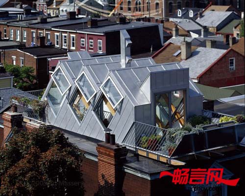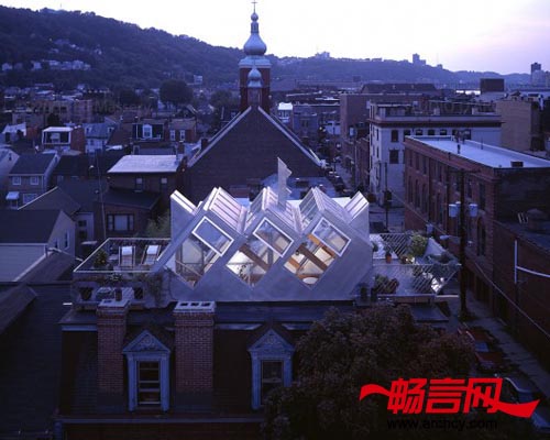 这个由ARC设计院设计的楼顶生态小屋位于宾夕法尼亚州匹兹堡市的一座19世纪的旧式排屋楼顶,该小屋是对这座始建于1978年的旧楼楼顶的一次改建工程,建成后,小屋成为了生态环保的楼顶花园和休息室,它更为主人提供了观赏城市美景的绝佳视野。