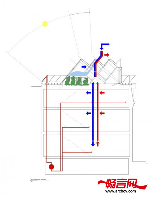 除此之外,生态小屋还能够为底下公寓补充热量(包括供暖和热水)。冬天,清新的空气、温室里的多余热量和植物呼出的气体会送达底下的公寓里。而当下午里没有多余的热量、或者气温不高的时候,鼓风机将从室外直接汲取气体,能源回收通风设备(ERV)会提取通风里90%的能量,供给楼下使用。ERV和通气管会尽力抽取高空的空气,然后再送达到公寓里,这样,就使公寓里的人不用呼吸来自于低处街道的劣质空气了。随后,这里还将安装太阳能热水系统和更高级的空气过滤系统,以便能过滤掉空气微粒、二氧化碳、二氧化硫等有害物质。
