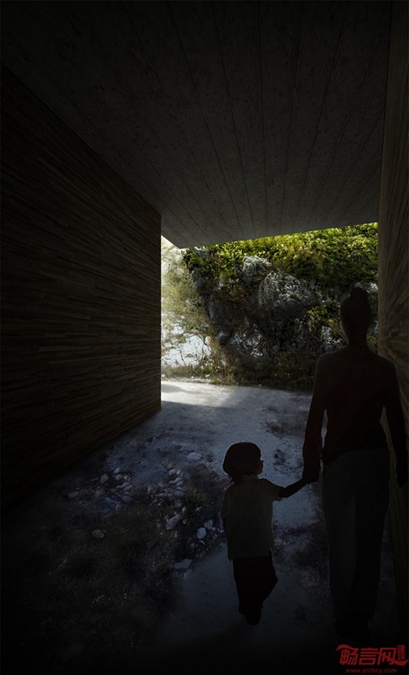 最近一个设计竞赛邀请设计师为意大利南部的城堡构想改造计划。城堡名为Roccamandolfi,Feng Xue, Kim Diep, Leonardo Lamanuzzi组成的设计团队共同完成了一项设计方案,为原古堡添加了一个新外层结构,这个结构墙面同时起到秘密通道的作用。项目要求增建方案不超过5米高,总面积不大于3000平米,城堡外最多开挖1米的深度,同时禁止对已有设施和树木的破坏。