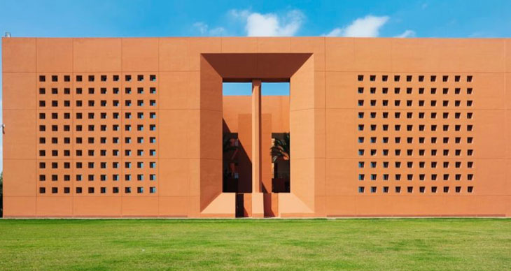 Ricardo Bofill在摩洛哥中部的Ben Guerir小镇内又创造了穆罕默德六世大学的理工学院教学楼。这几栋建筑占地33公顷,复杂结构实现了一个深思熟虑的城市设计,适合学生和教师日常学习和授课使用。教学楼的主要结构比较简洁,最高的一栋楼也就是21米高。整体非常适宜于步行活动的校园空间设计。中央一个主走廊穿过整片建筑群,亮色分别是商店、教室和公共活动空间。设计上大量运用了简单的几何图形,特别是正方形,是一个经常重复出现的元素。