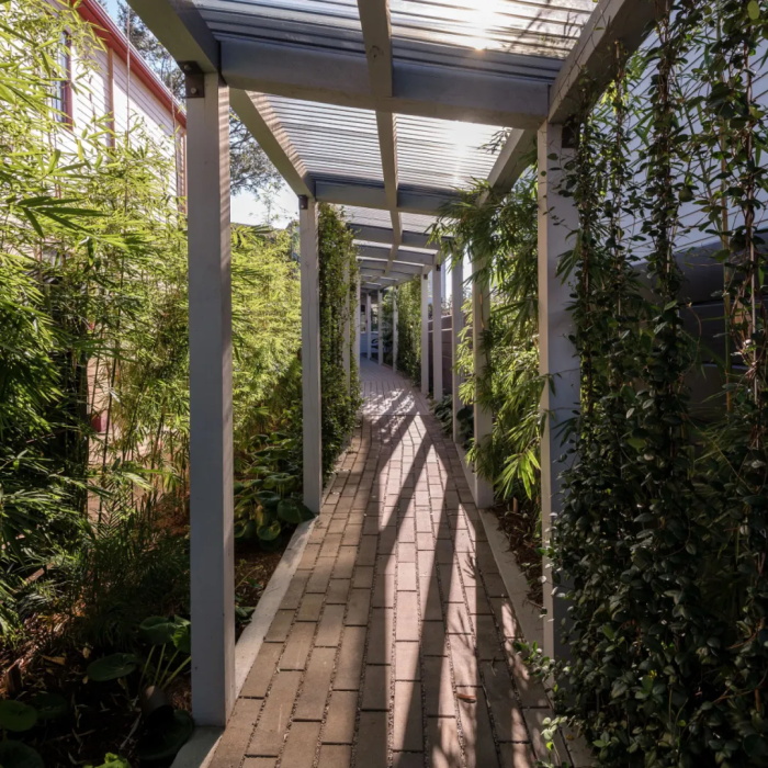 抵达建筑主体后,即可步入以橡树和泳池为中心的热带庭院空间。室内生活空间均朝向庭院,并通过环绕式连廊实现动线连接。建筑外立面采用搭接墙板覆层,与社区本土风貌相得益彰。屋顶线条经过巧妙处理,以确保从每条街道望去,建筑尺度都与周围环境保持比例协调。