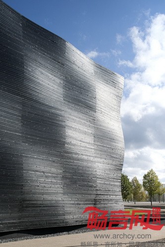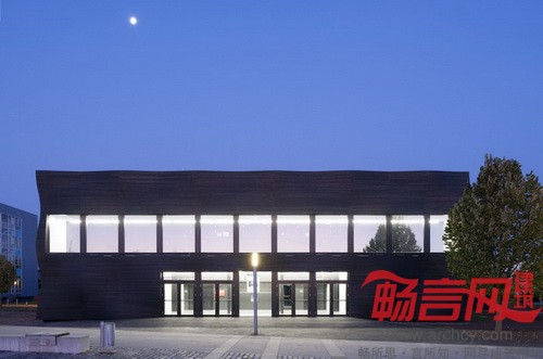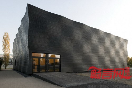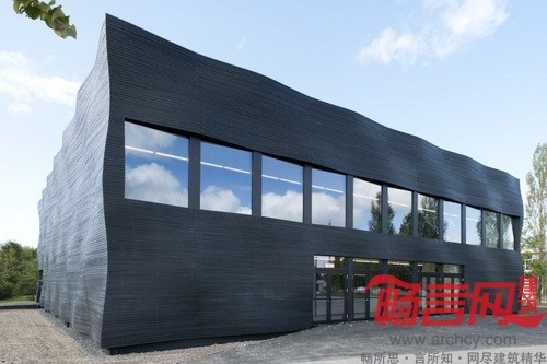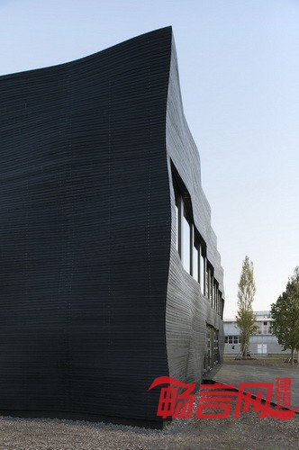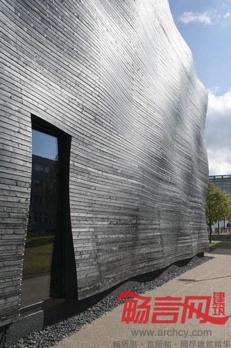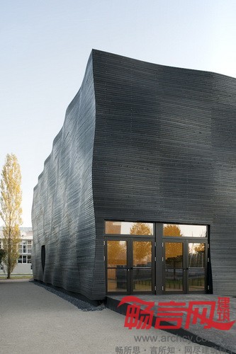 由于这栋教学楼的使用年限较短,同时也为了适应天气的变化,教学楼外墙采用了粗制加工的云杉木板,上面涂了一层黑色的颜料,这样就挡住了木板的纹理。另外,大楼外墙表面呈波浪形,使其整体显得更加活泼。