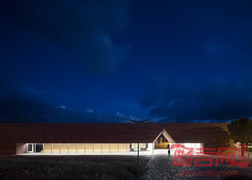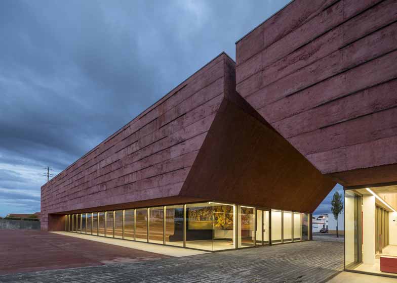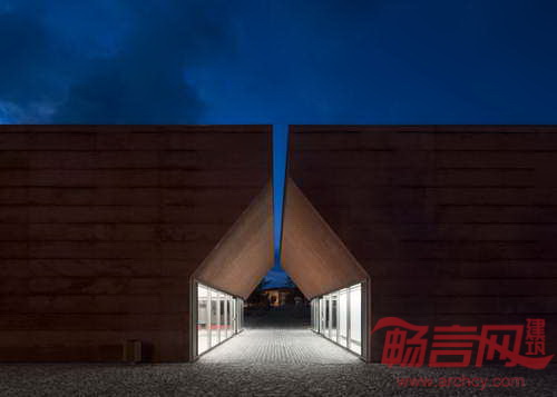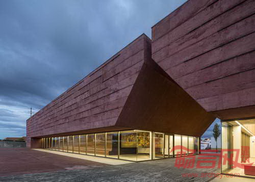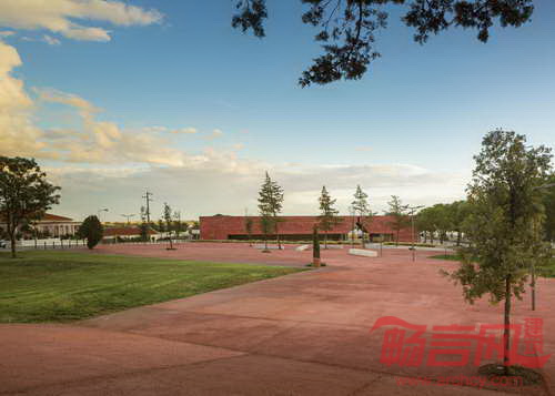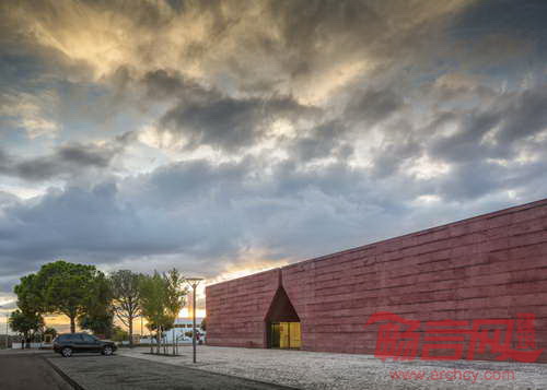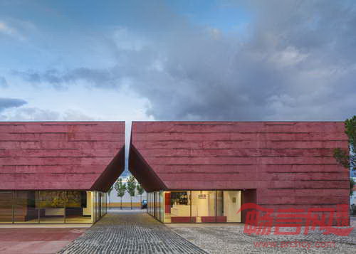 里斯本建筑师Goncalo Byrne设计了一座红色混凝土立面的葡萄牙游客中心,以纪念14世纪的葡西战争。项目是一个展示空间,纪念葡萄牙8年内战的首次战役——Atoleiros之战。由于不能将建筑建在战场遗址上,建筑师将项目选址定位葡萄牙东部小城Fronteira,场地俯瞰一个公园。建筑外墙是红色混凝土,粗糙的表面旨在模仿中世纪建筑不平滑的外形。建筑师表示,“建筑物令人联想传统中世纪建筑质感,十分接近手工制作的建筑表面。”
