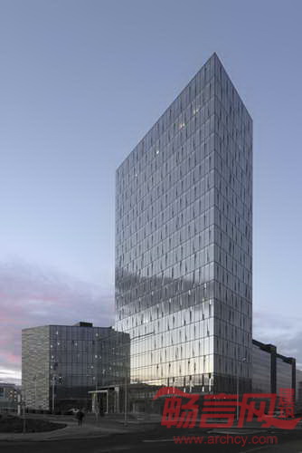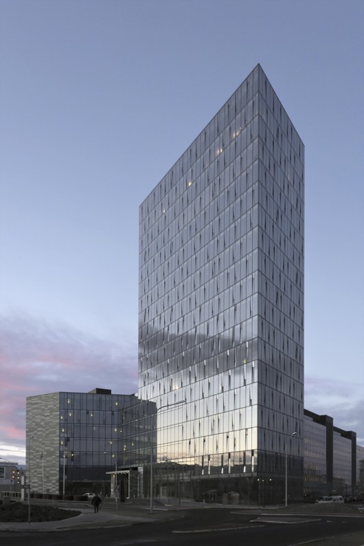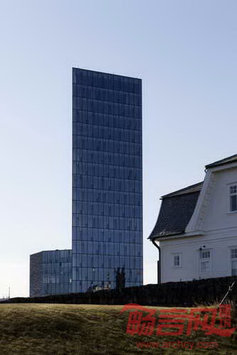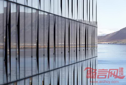 Turninn办公楼位于冰岛雷克雅未克,由PK建筑事务所设计。建筑面朝雷克雅未克海湾,遥望Esja山。占据城市天际线的不是低矮的建筑群,而是集合蓝色、白色和灰色的远方群山。以项目的高度和规模,建筑轻易地在城市环境中脱颖而出。设计师对建筑外立面细部处理倾注了谨慎的考虑。建筑包裹在独特的幕墙表皮中。外立面含有块面垂直玻璃孔洞凹陷,以貌似随意的形式出现在建筑表面中。项目采用1.5×3.5米的保固玻璃和可开槽玻璃板,帮助建筑自然地融入环境,同时有效降低了建筑尺度影响。