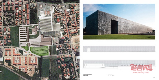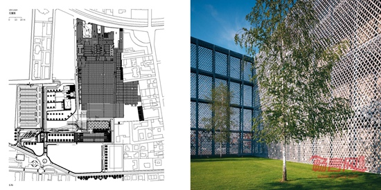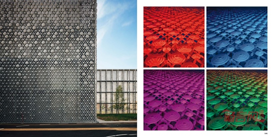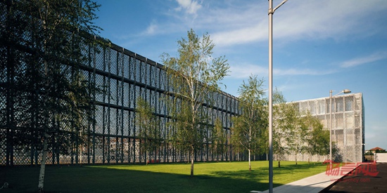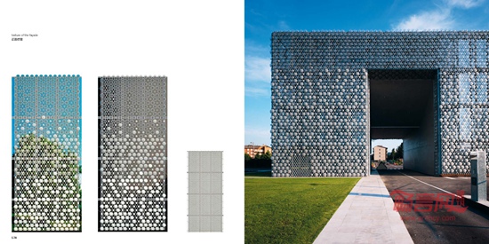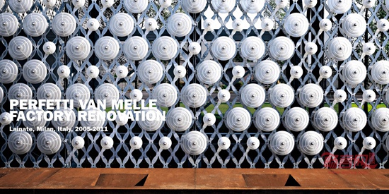 这座现有工业建筑群位于一块大面积绿地以及一个近期建成居民区的前方,属于Lainate市的郊区。这座工厂的整体改造包括了建设新办公楼、仓库和货物装载区、新停车空间、内部绿地和输送货物空间的重新设计。现有体量由一整个围墙围合,该围墙由一系列的双重装配结构的镀锌多孔板构成,多孔板上固定直径不同的玻璃圆盘。除了围起“山毛榉花园”、仓库和入口建筑物以外,这个“翼部”构成了一个长度超过200米的单一“胶状”建筑立面。这个新建筑立面将这座工业建筑群转化成了飘逸的城市立面,让人们联想起Lainate的Villa Litta所拥有的极为出色的喷射水柱喷泉,以及作为公司特色的焦糖和糖果的生产。新办公楼目前尚未建成,在设计构思上作为一种能源自给的机体,由3个平行柱体构成,柱体之间由开放庭院相连。