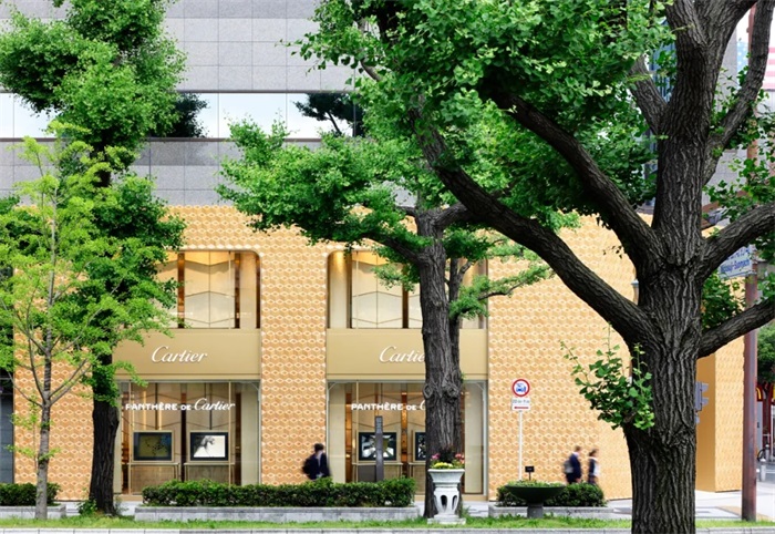 立面微凸的互锁钻石几何图案以卡地亚经典珠宝和日本传统清酒盒形态为灵感。使用的桧木均是60到70年树龄的当地木材。项目包含12种不同的木制结构单元,分别出现在立面、转角、踢脚线和拱窗的建造中。项目共使用了2500个木制单元,每个均由京都的木匠大师以精湛的细木工技艺制成。