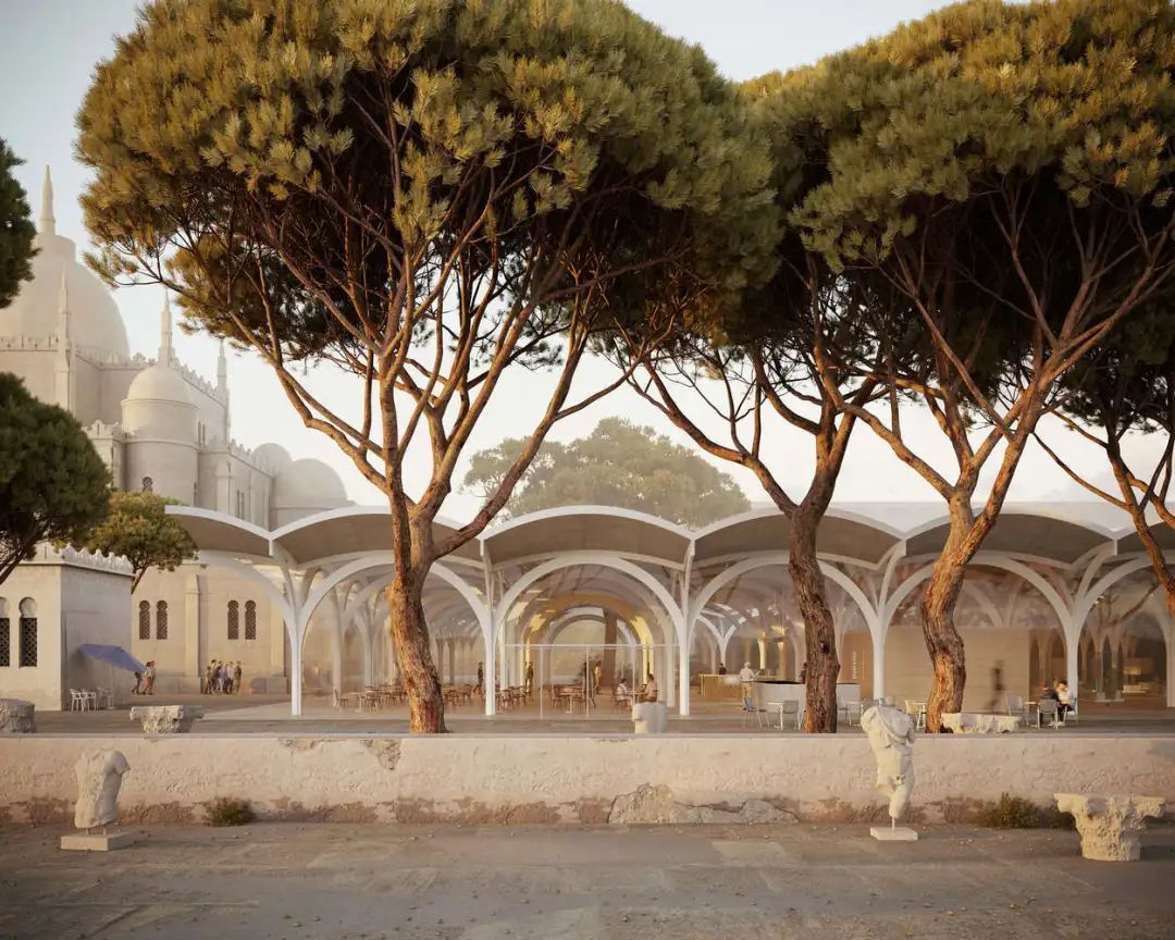 设计坚持场地的历史和考古意义,同时考虑生态敏感性。该设计没有在庭院上建造一座全新的建筑,而是采用了轻盈透明的伞状结构,覆盖了整个空间,可以欣赏到整个挖掘过程对地中海的视野。新结构的网格化和模块化设计与相邻建筑和谐融合,显示出自信和克制。尽量减少施工干预,尊重该遗址的深刻考古重要性。