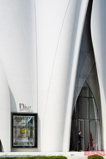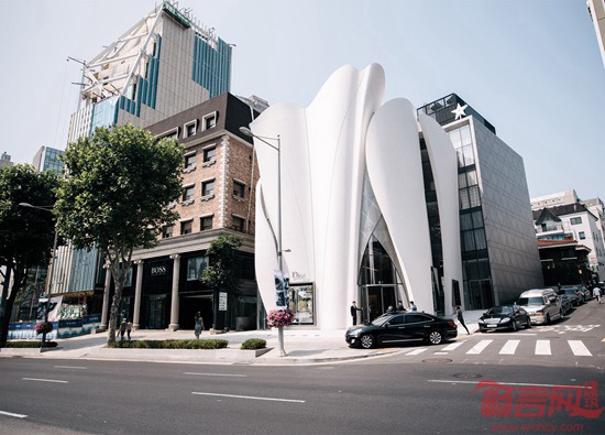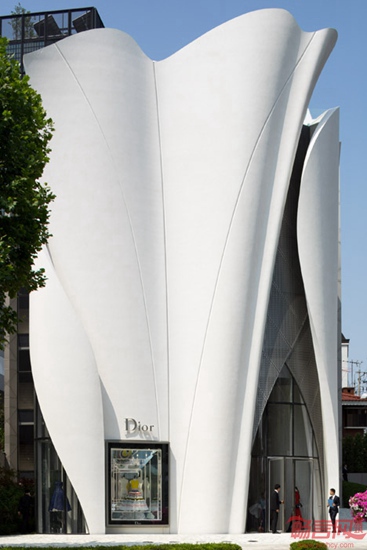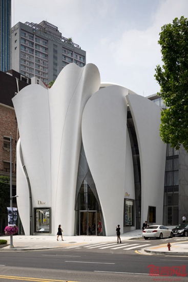 建筑师Christian de Portzamparc设计了韩国首尔迪奥时尚店,店内出售男女时装和配件。项目坐落于奢侈品店林立的江南区,在一个街角位置上,除了商品陈设还包含展区和咖啡厅。建筑采用雕塑外感的白色玻纤板材,每块有20米高,具有缓和的弧度,符合法国迪奥时装的流线形态。一部分板材构成建筑外墙,另外一部分构成六层商店的弧形入口。