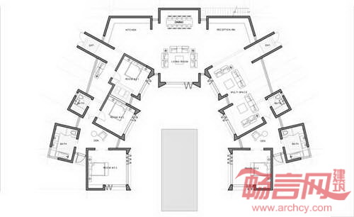 度假住宅位于济州岛南端的葛札瓦森林中,工程已于3月7日破土动工,预计将于2014年9月竣工。中央庭院带有10米宽的矩形泳池,庭院向海洋延伸。四个独立的入口区域和模块式的建筑结构使度假综合体既形成了单一体量,同时也被划分成不同住宅单元。建筑具有屋顶花园,将地标景观向垂直方向延展,营造出饱览瑰丽夜色和森林华盖的理想环境。
