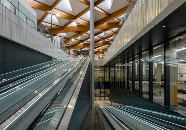 起伏连绵的20,000平方米悬浮屋顶以可持续技术与极具表现力的设计统一整个建筑群。屋顶重2,500吨、长度达230米,由594根胶合层压木(glulam)梁 与407个覆有太阳能板的金字塔形铝制模块 构成,有效降低建筑的日常能耗。屋顶结构的形态经过优化,以提升效率与可持续性能。