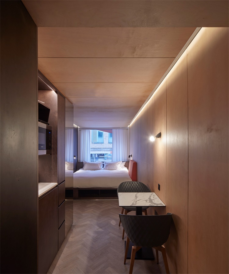 酒吧设在一层,上方的20个集装箱中,每个都容纳了迷你公寓型房间,室内装饰采用大理石和碳化木。多功能床充分利用了有限的空间,靠墙的靠垫可以用于看电视休息