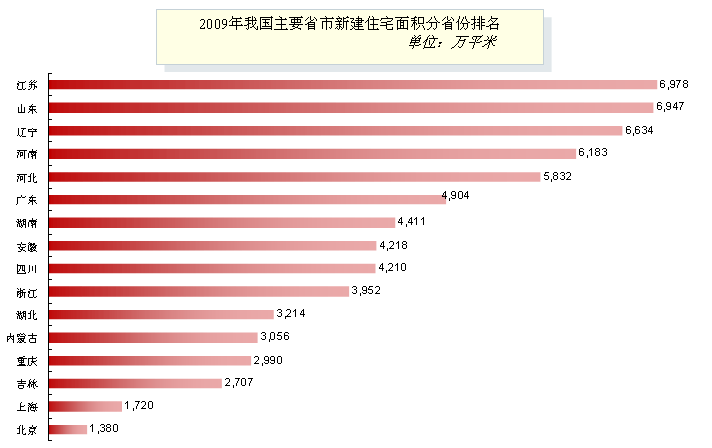 国家统计局发布的我国房地产市场相关数据显示:2009年我国房地产开发企业住宅新开工面积为92,463.5万平方米。排名靠前的省市(下图)住宅开发面积占到了全国的75%左右,其中排名前五的江苏、山东、辽宁、河南、河北等地新建商品住宅面积均在5,000万平方米以上。如下图所示: