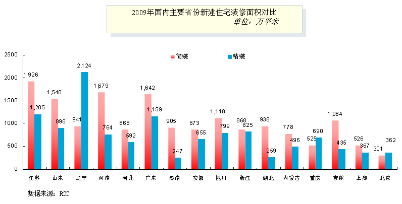 结合以上数据,根据RCC工程信息系统得出的主要省份不同装修类型住宅项目占比,我们可以得到2009年主要省份新建的有装修住宅面积,辽宁、江苏、广东三省新开发精装住宅面积明显高于其它省份,具体情况如下: