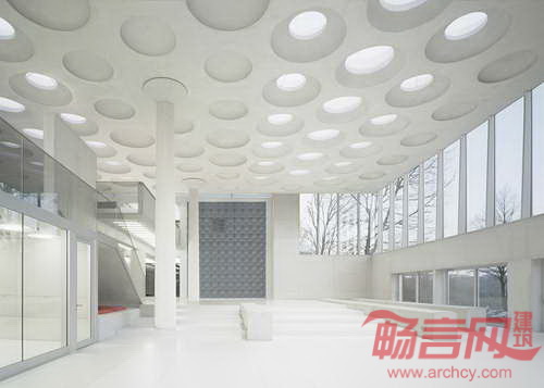 建筑中心是巨大的双层礼堂,占据两层的空间顺应了场地的自然坡度。凹形天花引人注目,结合了天窗以及一整排混凝土柱。饰板的设计减少了承重结构的实际重量,并展示出了空间的进深。