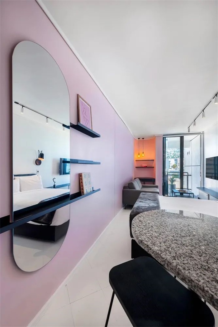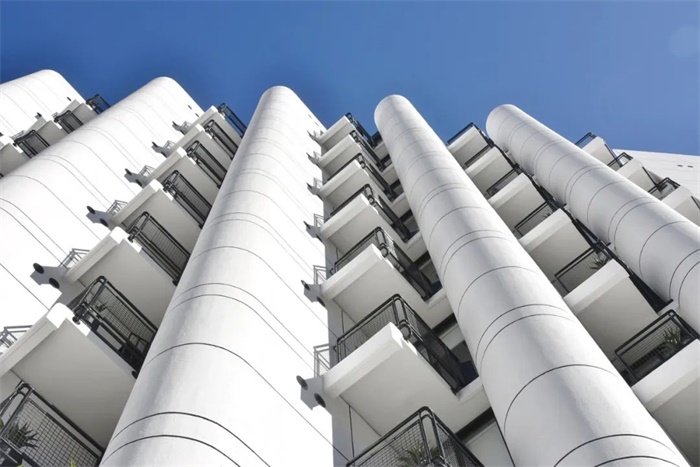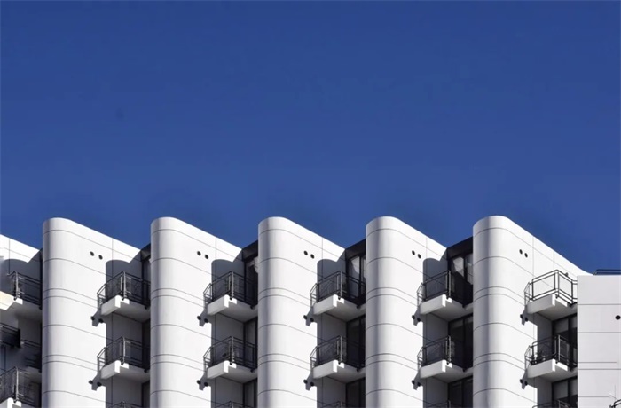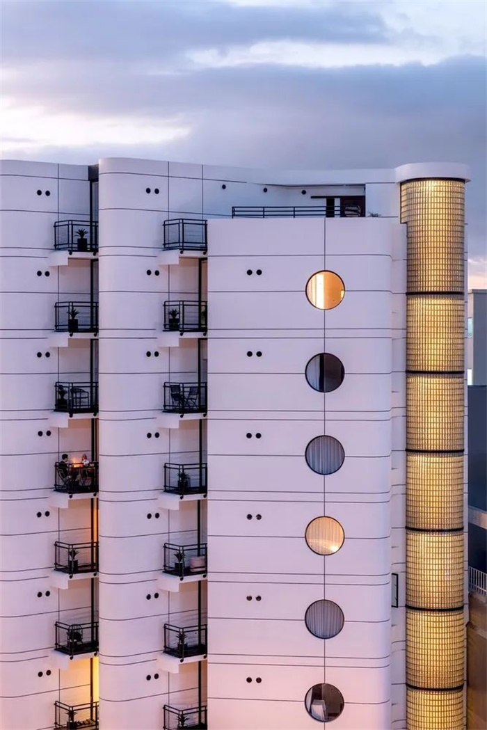 Flamingo 假日公寓的名字参照了充满乐观的热带现代主义,其将二三十年代严肃的欧洲设计与迈阿密、里约热内卢和檀香山等沿海度假城市的华丽奢侈结合在一起。项目的造型俏皮并具有薄薄的雕刻感,就像炙手可热的包豪斯一样。度假公寓相距大海一个街区,共计九层,包含从 25 平方米的单间公寓到 29 平方米的一居室转角单元,且其占地面积不超过 525 平方米。