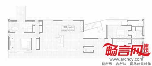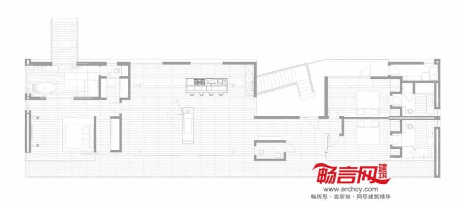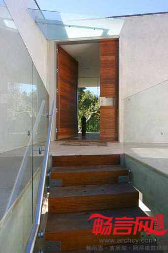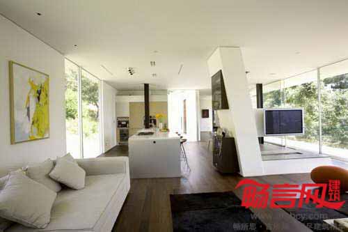 通过落地玻璃门的使用,创造出室内外无缝化的流畅连接效果,并构成材料的内外统一性。