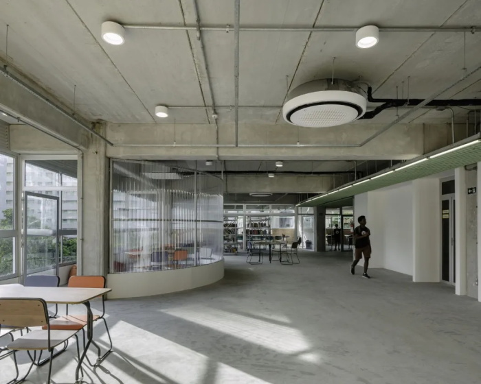 这栋建筑面积达 4500 平方米的建筑共分为四层:首层围绕着一个拥有双层挑高的有顶抵达庭院布置,该庭院纵向贯穿整栋建筑,设有休闲区和餐厅等更为集体的功能空间。一层为行政办公区,而上面两层则为教室、实验室和艺术教室,可通过一个大型辅助空间进入。屋顶完全开放,作为一个大型露天广场,可满足多种用途,并与周边景观相得益彰,拓展了户外活动的可能性。