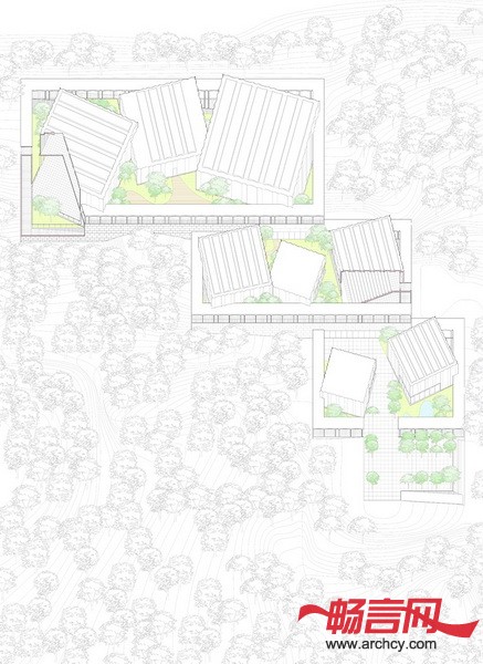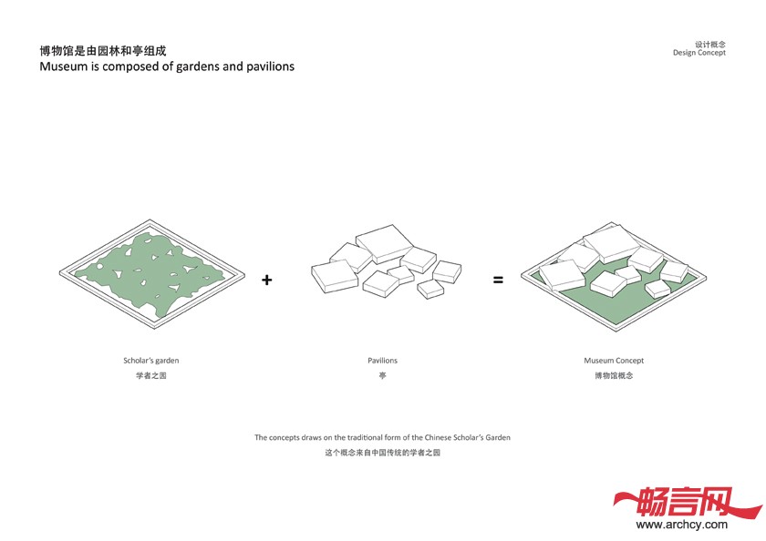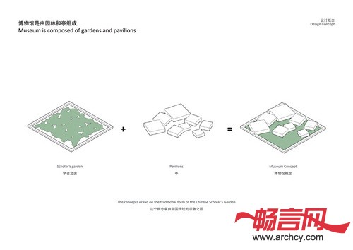 博物馆包括三部分:位于边上的柱廊,小亭和花园。花园是根据中国古代文人的花园而设计的,它的特点是界限明晰、景物相谐而置和一种绝缘于室外之感以激发创作灵感。博物馆位于三个梯形地块上,所以每个建筑都位于高处,而且成为一处新的景观。