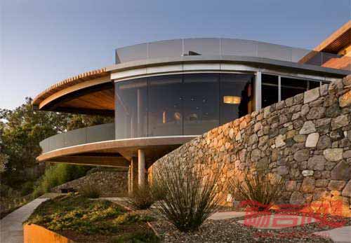 Carver + Schicketanz公司为加州Big Sur一对退休夫妇设计了滨海房屋。场地南北端坡地上栽种了雄伟的橡树,西面是广阔无垠的太平洋。巨大的岩石基础将建筑结构与山坡地形连接起来,坚实地形与建筑使用的轻型钢材和玻璃元素形成鲜明对照。