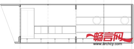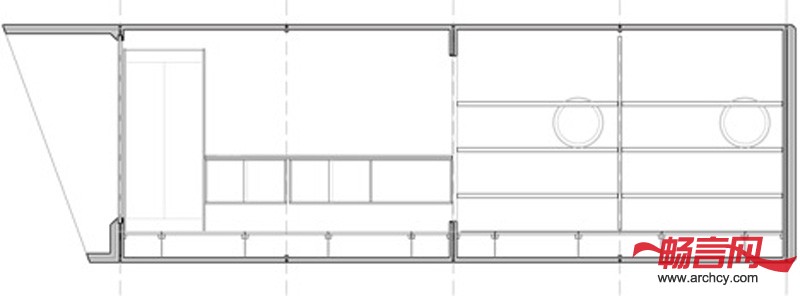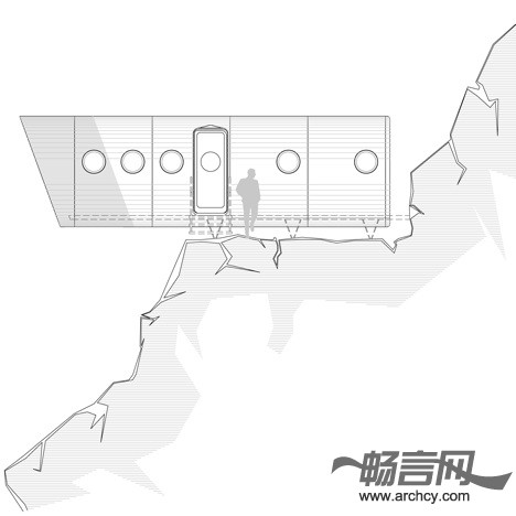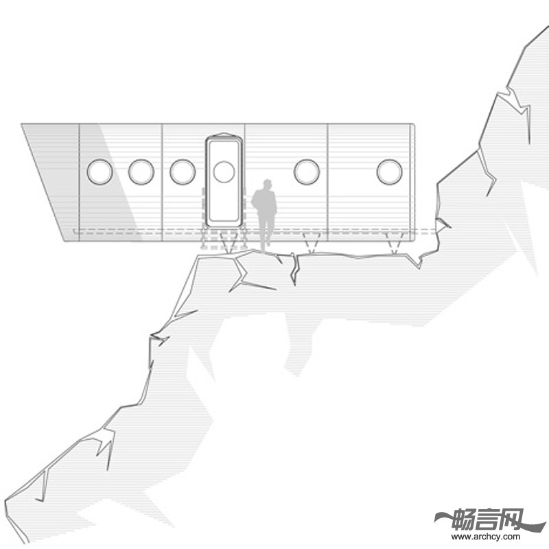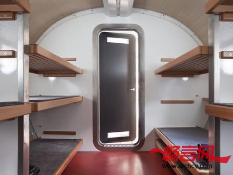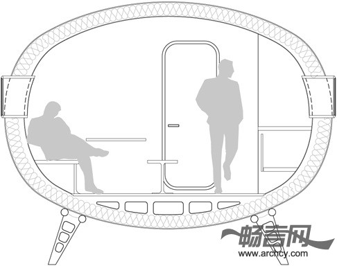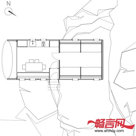 小屋的后端是上下铺床和储物柜,起居室、厨房及餐桌位于悬臂部分。