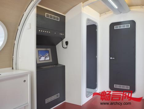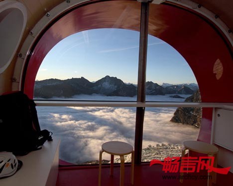 小屋还有一扇大窗户,从这里就能将外面阿尔比斯山的壮丽景色纳入眼底,从计算机里你还可以随时掌握天气变化情况。屋顶的光伏电池板可以为小屋供电。