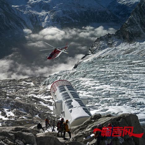 小屋是预先在工厂里制造,然后用直升机空运到场地上的。因为是预先都已经制作好了,所以,到场地之后,只用几个小时就能将它安装好了。